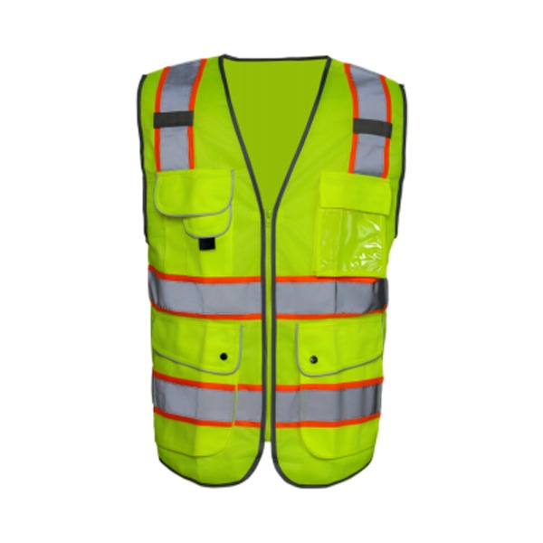 MATERIAL: 120g low-stretch yarn + 8CMpadding, high-brightness second-class reflective strips, reflective strips on the bag cover, gray Oxford cloth edging. Placket, black resin zipper2 lower pockets + double pockets on the leftchest including a transparent PVC document pocket, a zipper pocket + pen bag on the right chest,2.5cm webbing on the upper shoulder