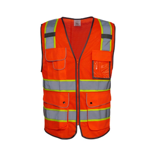 MATERIAL  Mesh: 110g, 120g low-stretchyarn + 8CMpadding, high-brightness second-class reflective strips, reflective strips on thebag cover, gray Oxford cloth edging. Placket.black resin zipper 2 lower pockets + a transparent PVC bag on the left chest, a zipper bag on the right chest + a pen bag, buckle 2.5cm webbing on the upper shoulder