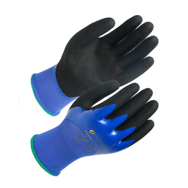 Glove made of textured polyester and fully coated in smooth nitrile on the back and sandy nitrile on the palm, with seamless interior.
